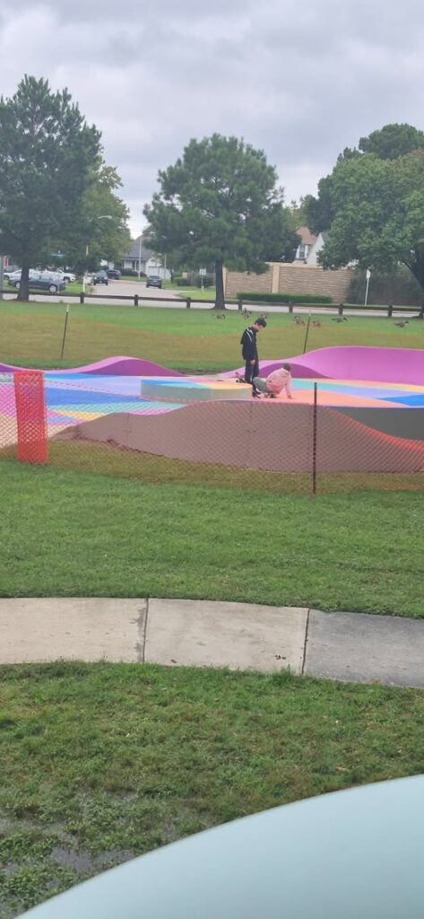 Who wants to help? The kids are hot to trot to get back on the track. If you see someone on it, please kindly ask them to vacate. Walking and skating on the track damages the work and delays reopening.